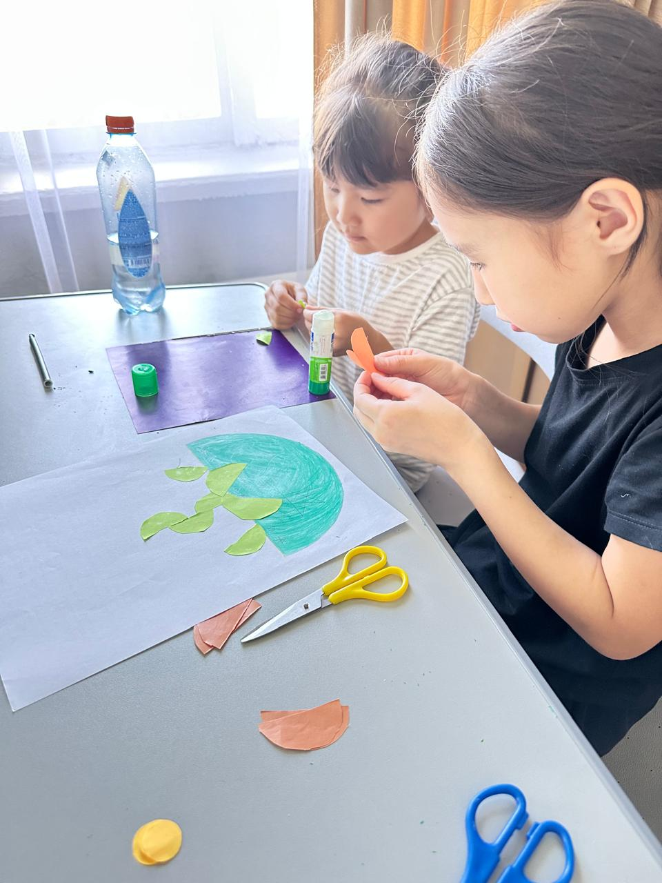 Бүгінгі күн балалар үшін ерекше көңілді және пайдалы өтті. Таңертеңгілік тынығудан кейін балалар шығармашылық сабаққа қатысып, қағаздан түрлі пішіндер қиып, жабыстыру арқылы әдемі қолөнер бұйымдарын жасады. Олар жарты шеңберден жасыл жапырақтар жабыстырып, табиғат тақырыбындағы суреттер құрастырды. Бұл жұмыс балалардың ұсақ моторикасын, қиялын және түстерді ажырату қабілетін дамытты.